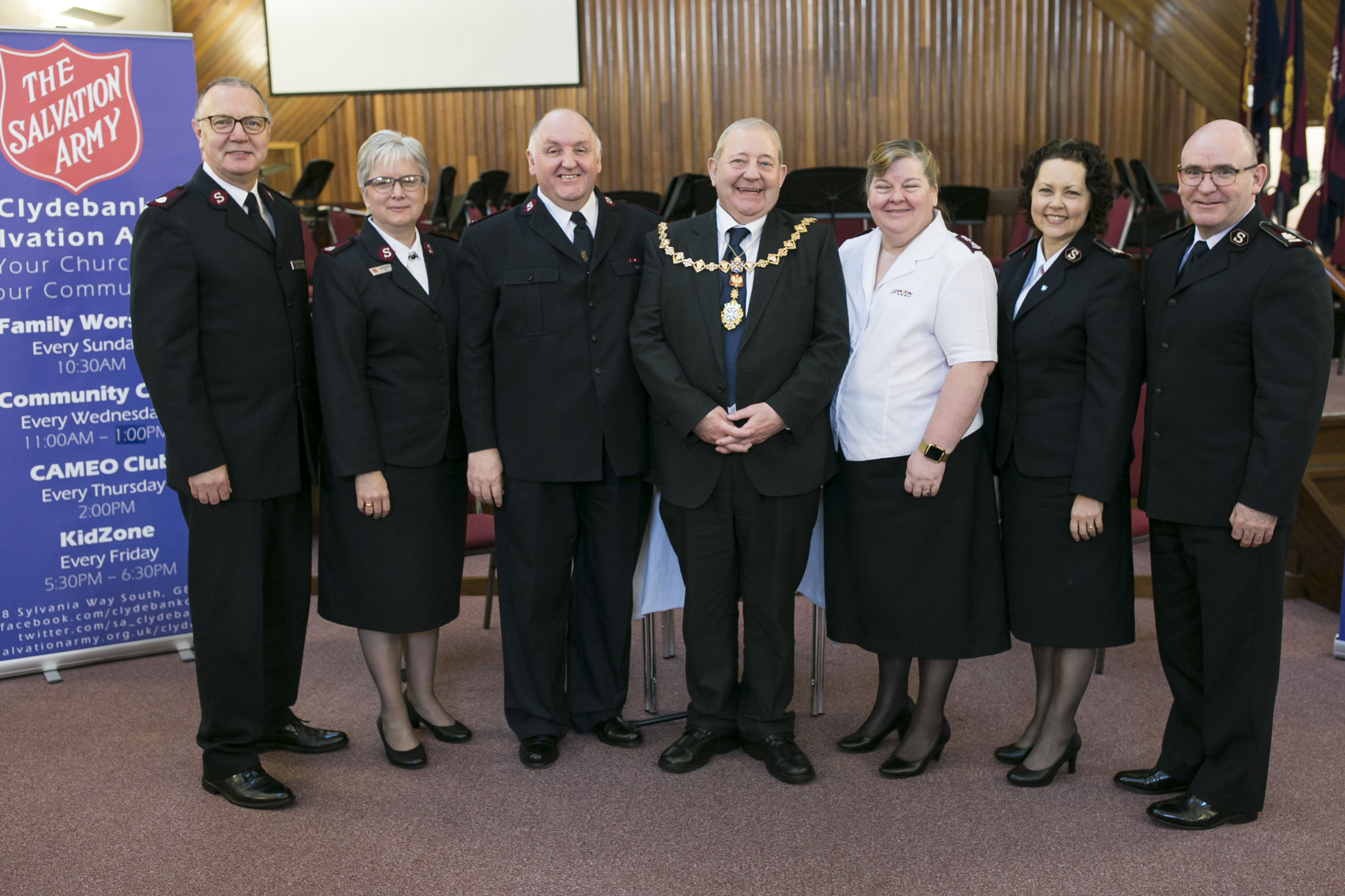 Anniversary events began with an informal reception in the company of Provost William Hendrie, civic leader of the local council. The commissioners were greeted by the Provost who thanked The Salvation Army for the important work being carried out by its officers, volunteers and staff. He told them: ‘The Salvation Army carries out vital work in over 130 countries internationally. This work is made up of countless local branches like the Clydebank Corps, which has constantly offered care and support to many who have sought help. For that reason, it is an integral part of the local community here.’