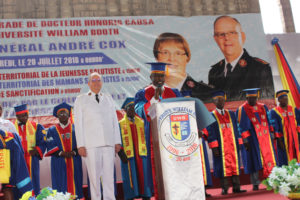 London, 31 July 2018/IHQ/ – AS was appropriate for his final overseas visit as The Salvation Army’s international leader, General André Cox’s time in the Democratic Republic of Congo Territory contained a number of significant events, including the presentation of the Army’s highest honour and the awarding of an honorary doctorate.