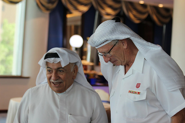 The party then moved to host a lunchtime thank you reception for 60 people, both Kuwaiti and expatriate, including embassy staff, senior church leaders, lawyers and lay people. The guests were representative of many people who have helped The Salvation Army’s development in Kuwait. All who attended received a small gift of Salvation Army tea, and a cup and saucer candle with the tag ‘All the darkness in the world cannot extinguish the light of a single candle’ (Francis of Assisi). The General was presented with his own ghutra or kufiya headscarf, which a willing Kuwaiti helped to arrange.